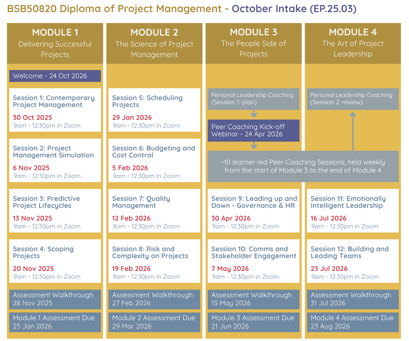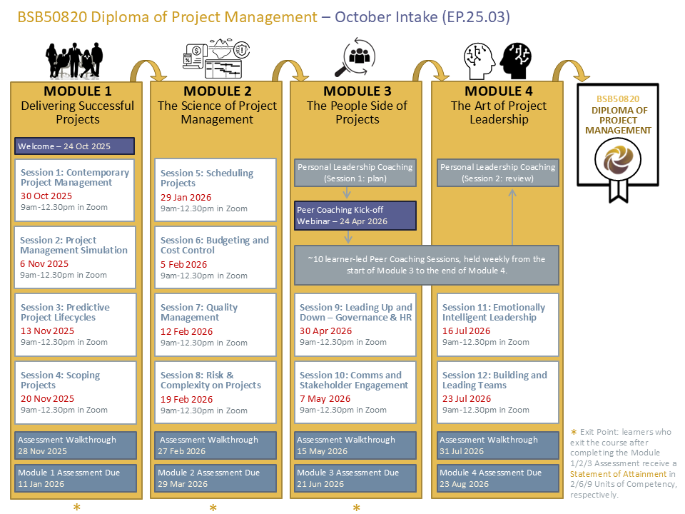 Successful completion of all four modules results in the award of the nationally recognised BSB50820 Diploma of Project Management.